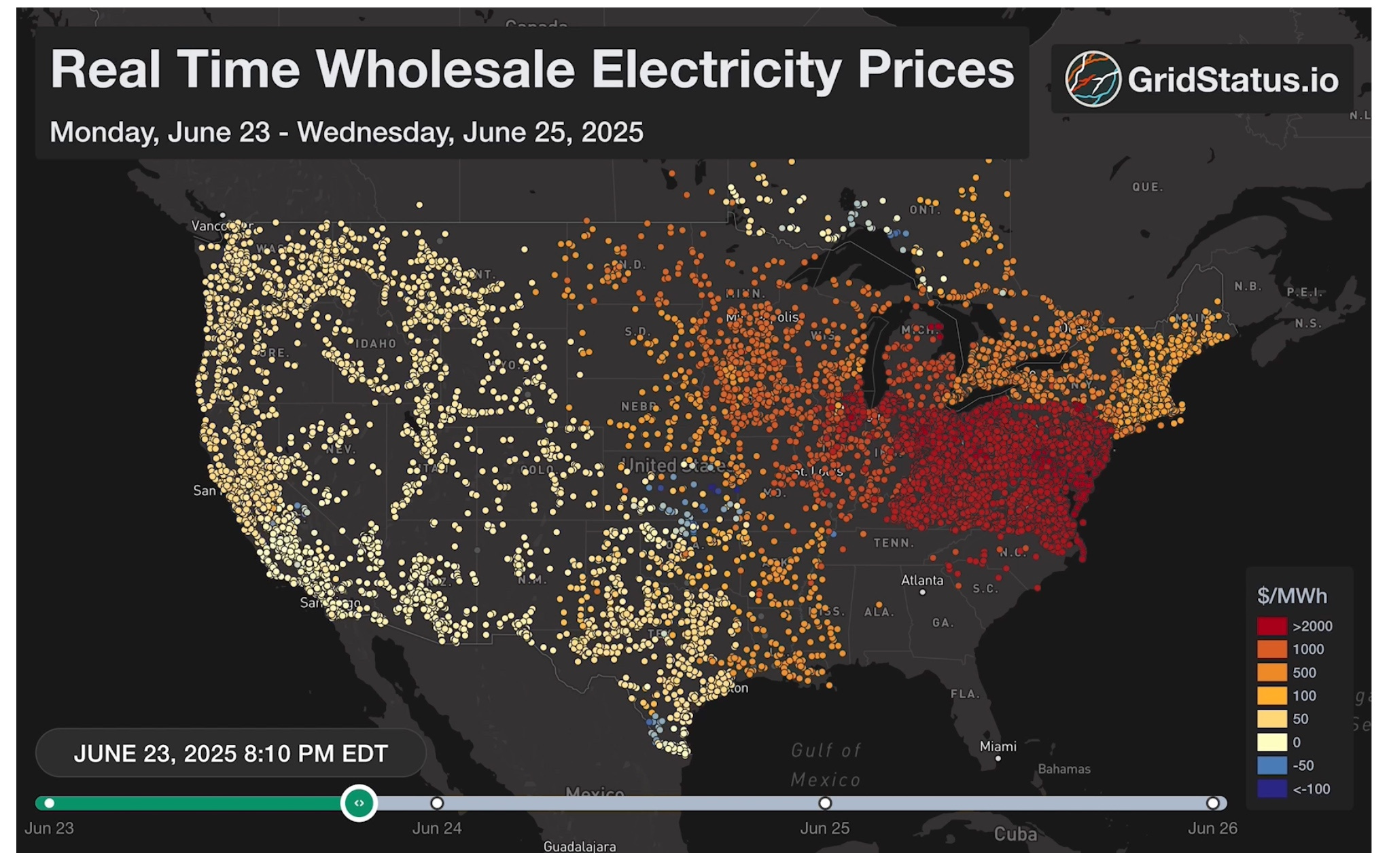 Reserve margins in PJM (Eastern interconnection) shrank to ~3 %, day-ahead prices in ISO-NE (New England) cleared at >$400/MWh, and Long Island’s real-time LMP briefly spiked above $9,000/MWh. Emergency DR, voluntary curtailments and behind-the-meter solar helped keep the lights on, but also exposed how little controllable load remains on call.