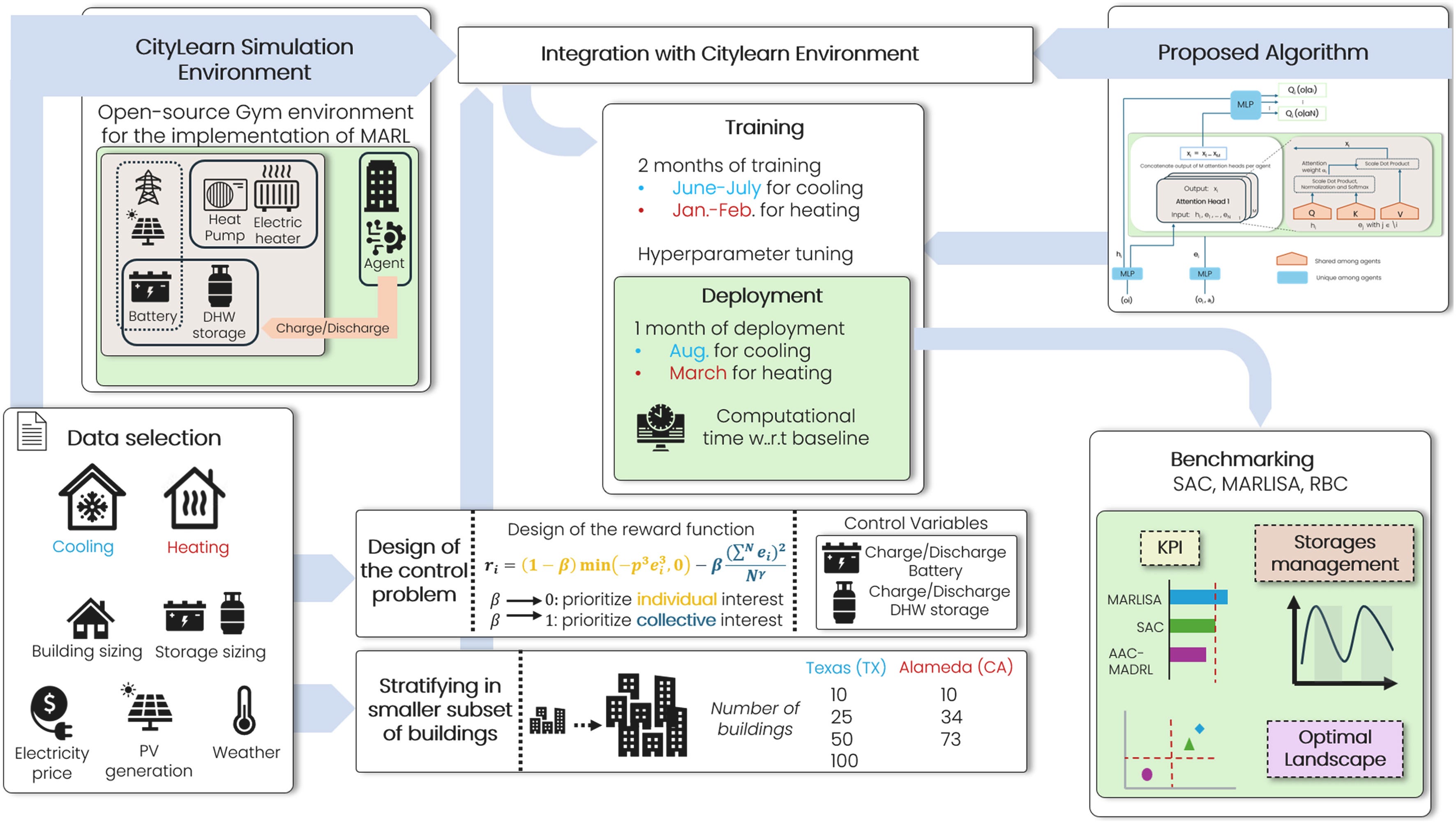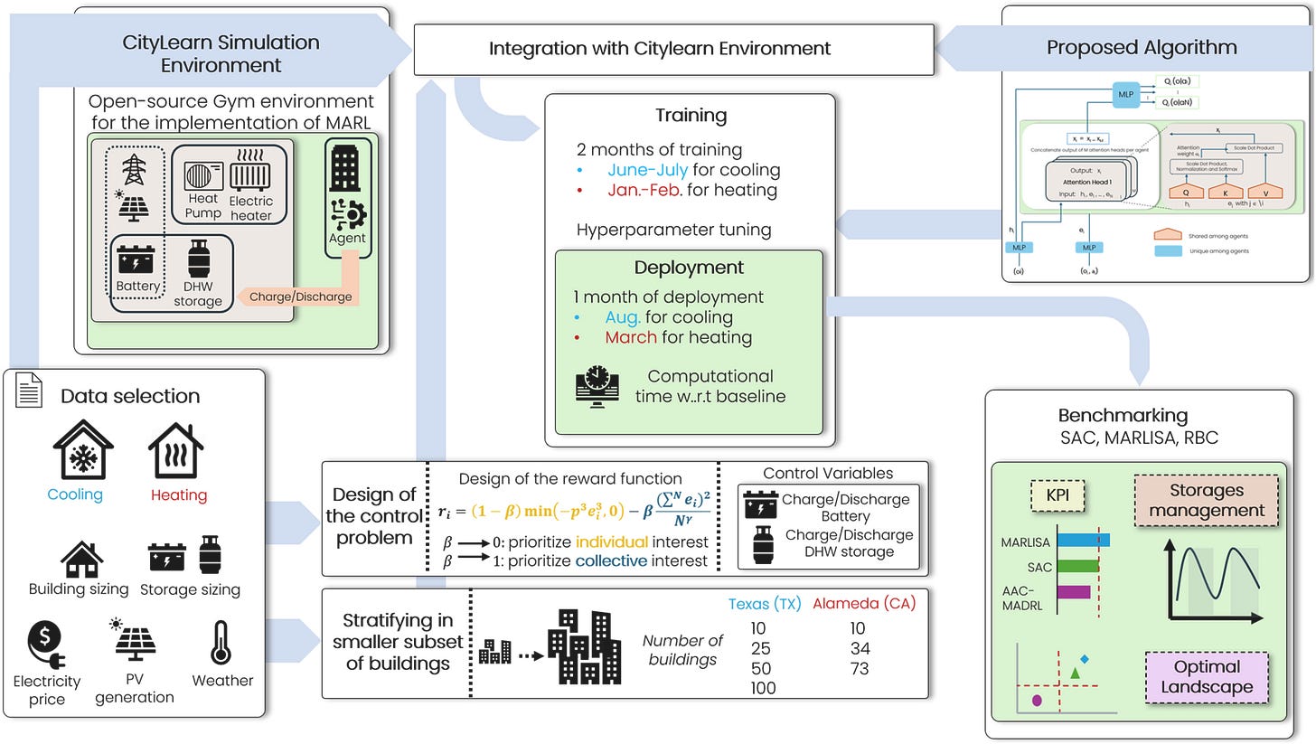 residential districts based on an attention-driven multi-agent DRL approach” proposes an attention-based multi-agent reinforcement learning algorithm where each building in a district acts as an agent. These agents learn to cooperate in managing their energy consumption, storage, and generation to achieve collective goals like reducing peak demand and minimizing energy costs.